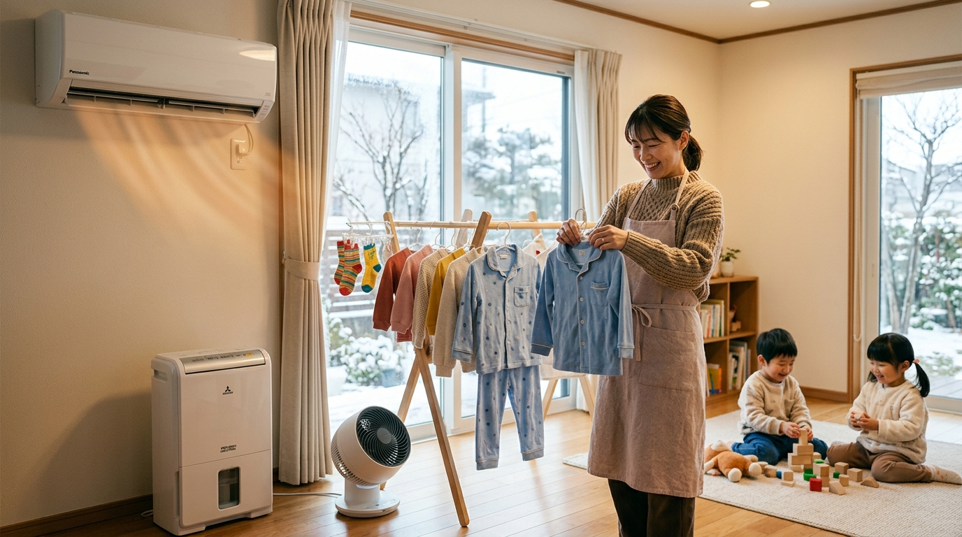 朝、子供たちのパジャマを取り込もうとして、ひんやりとした感触にがっくり肩を落とす。外の気温は10度以下、部屋の中も暖房をつけているとはいえ、なかなか洗濯物が乾きません。特にうちには活発な子供が2人いるので、毎日たくさんの洗濯物が出るんです。冬場は乾きにくさに加えて、生乾きの嫌な臭いがついてしまわないか、雑菌が繁殖しないかと心配が尽きません。せっかくきれいにしたはずの服が、もう一度洗い直したくなるような気持ちになってしまうことも。