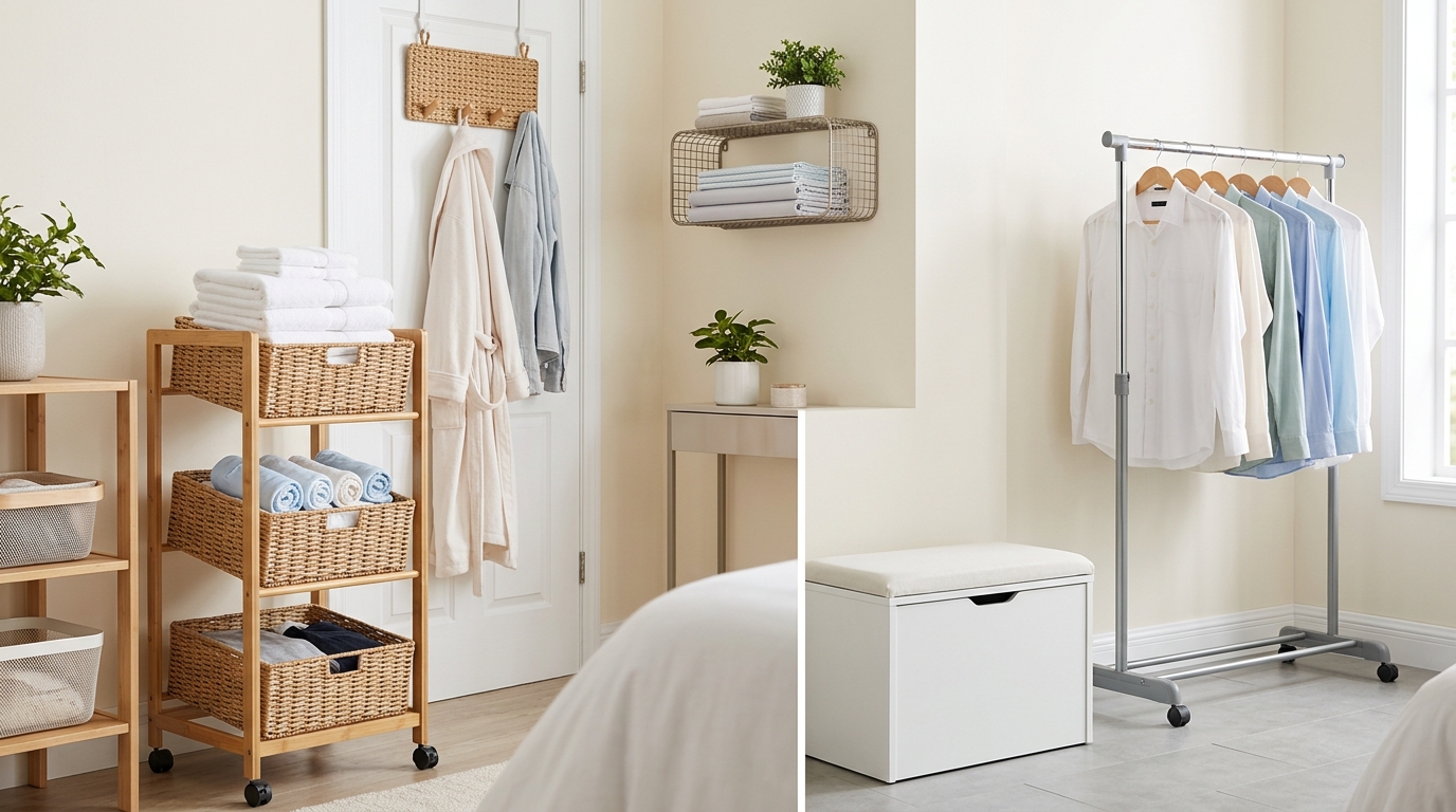 - ドアハンガーや壁付けフック:脱いだパジャマや、明日着る予定の洋服を一時的に掛けておくのに便利です。