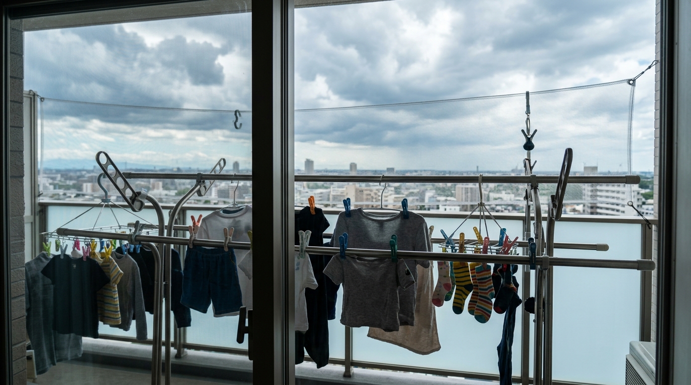 ベランダに出た瞬間、ごうごうと吹きつける風。9階という高さは、見晴らしが良く開放感がある反面、洗濯物にとってはまさに「強敵」です。特に子供が二人いる我が家では、毎日大量の洗濯物が出るので、この強風との戦いは日課のようなものでした。