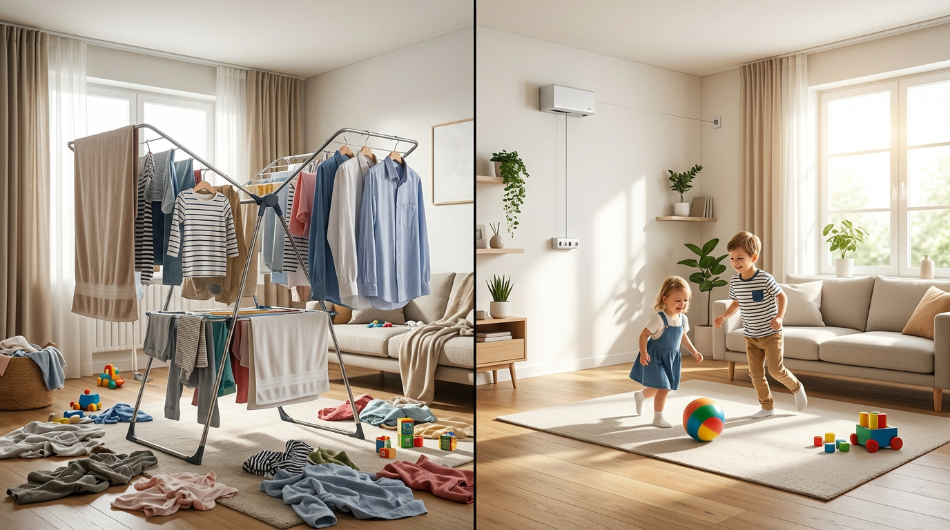 リビングは子供たちが一番遊ぶ場所です。以前は洗濯物で占拠されていましたが、ワイヤーを収納すれば、すぐに広々とした空間が戻ってきます。これで、室内でのボール遊びや追いかけっこも、洗濯物を気にする心配がなくなりました。 -