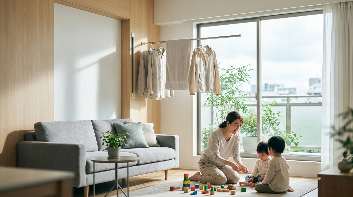 狭いマンション住まい、共働きで日中に外干しできない日が多い我が家にとって、部屋干しは日常茶飯事。でも、増え続ける子供たちの衣類、タオル、おむつカバー…その量は想像をはるかに超え、いつしかリビングは物干し竿と化していた。来客があるたびに、せっかく片付けたリビングが「洗濯物だらけの部屋」に戻るのがストレスで仕方なかった。
