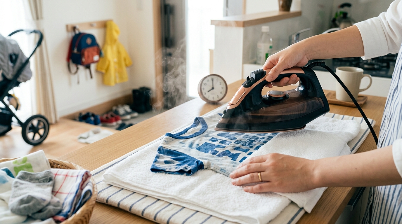 上の子が「これじゃなきゃ嫌だ!」と譲らないお気に入りの服だったり、下の子の急な着替えで「あれがない!」となる時。そんな時こそ、この「アイロンで洗濯物を爆速乾燥させる技」が本当に助けになっています。今回は、私が日々実践している、生乾き知らずの5分時短術をご紹介します。