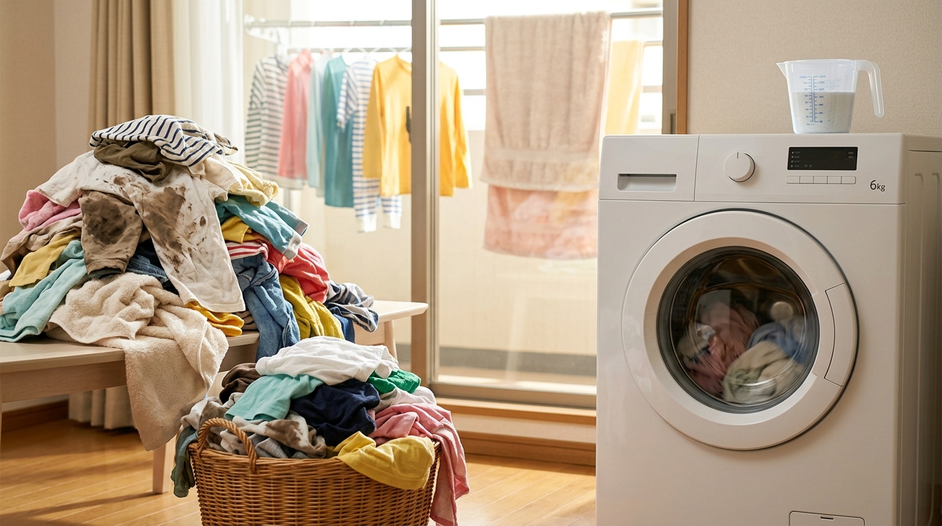 そんな私を救ってくれたのは、「洗濯物6キロ」という具体的な目安と、ちょっとした視点の転換でした。自分が毎日どれくらいの量を相手にしているのかを知ることで、ようやく効率的な戦い方を見つけられたのです。今日は、その時短ワザをご紹介したいと思います。