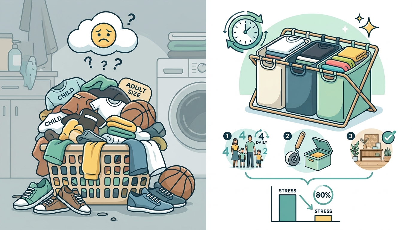 よく考えてみれば、わが家の洗濯物入れは、「とりあえず」で選んだ何の工夫もないシンプルなカゴ。見た目も使い勝手も二の次にしていました。これでは、洗濯物をただ一時的に放り込むだけで、その後の作業効率が悪くなるのも当然です。脱衣所は狭くなるし、洗濯物を仕分けする手間も増える。結果、家事の時間が長くなり、家族と過ごすはずの貴重な時間まで削られてしまっていたんです。