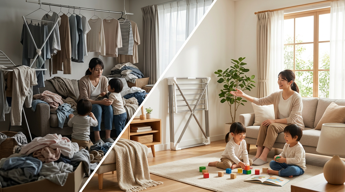 毎日の洗濯物、皆さんどうしていますか?我が家は元気盛りの小学生と幼稚園児がいて、一日中洗濯機が稼働しているような状態です。朝から晩まで洗濯物との格闘で、特に雨の日や花粉の時期は地獄絵図。
