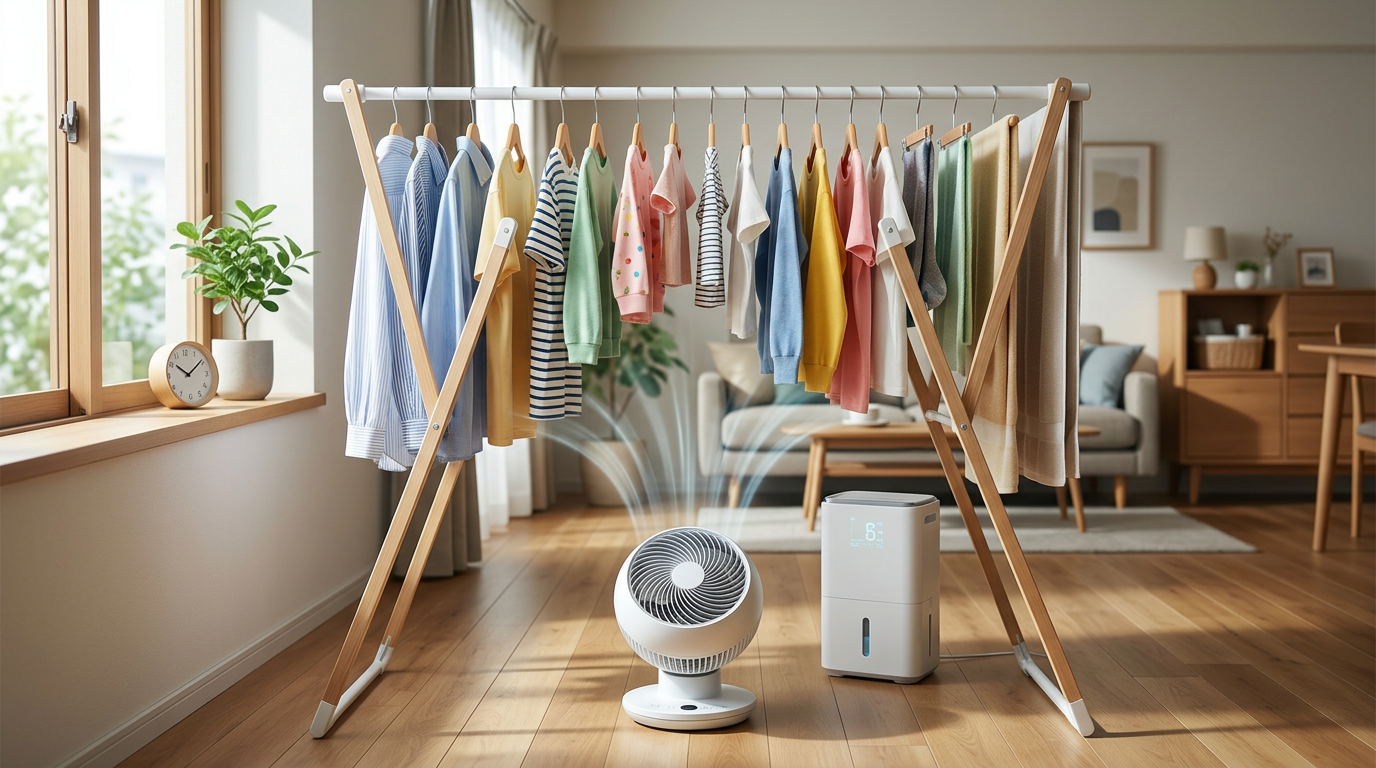部屋の湿度が高いと、洗濯物から水分が蒸発しにくくなります。除湿機を併用すると、驚くほど早く乾きますよ。除湿機がない場合は、こまめな換気でも効果があります。乾燥機付きの浴室があるなら、そこをフル活用するのも手です。