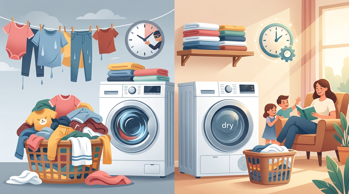 時間節約の最強の味方は、やはり乾燥機です。乾燥機があれば、干す手間と取り込む手間、そして天気予報に悩まされるストレスから解放されます。