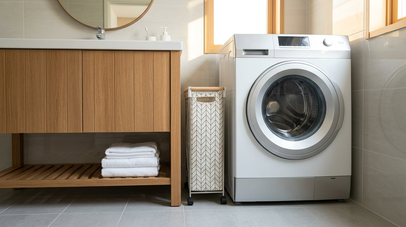 以前は、よくある円筒形や四角い形の、そこそこ幅のある洗濯物入れを使っていました。それはそれで容量があり便利だったのですが、狭い脱衣所ではその「幅」がとにかく邪魔だったんです。洗濯機と洗面台の間のわずかな隙間、壁と洗濯機の間のデッドスペースなど、どうにか有効活用できないかと思っていました。